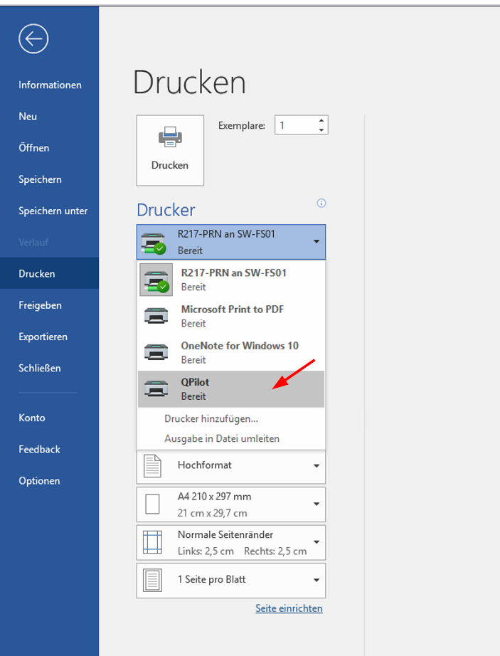 Schritt 2: Wähle "QPilot" aus und klick anschließend auf "Drucken"
