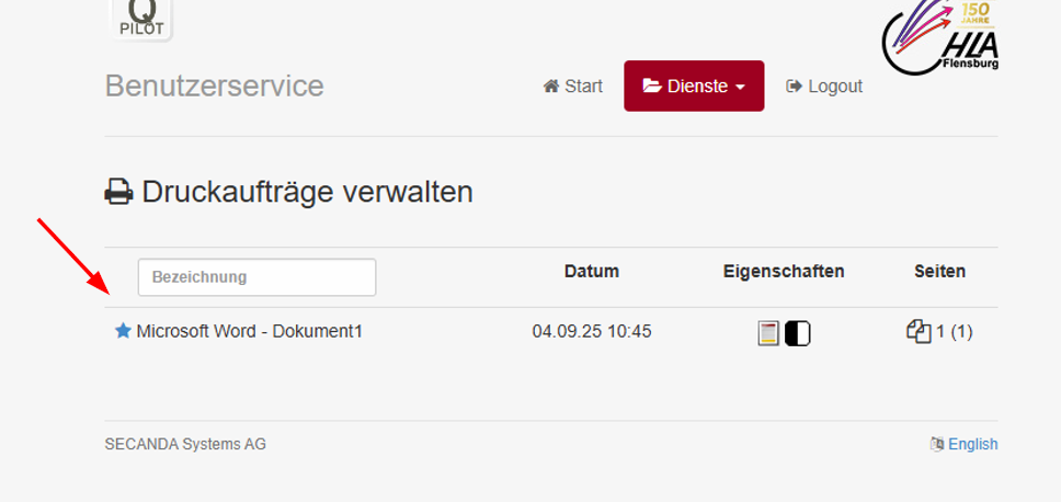 Sobald man sich bei print.hla-flensburg.de anmeldet und die Druckaufträge aufruft, sieht man dort den neuen Auftrag